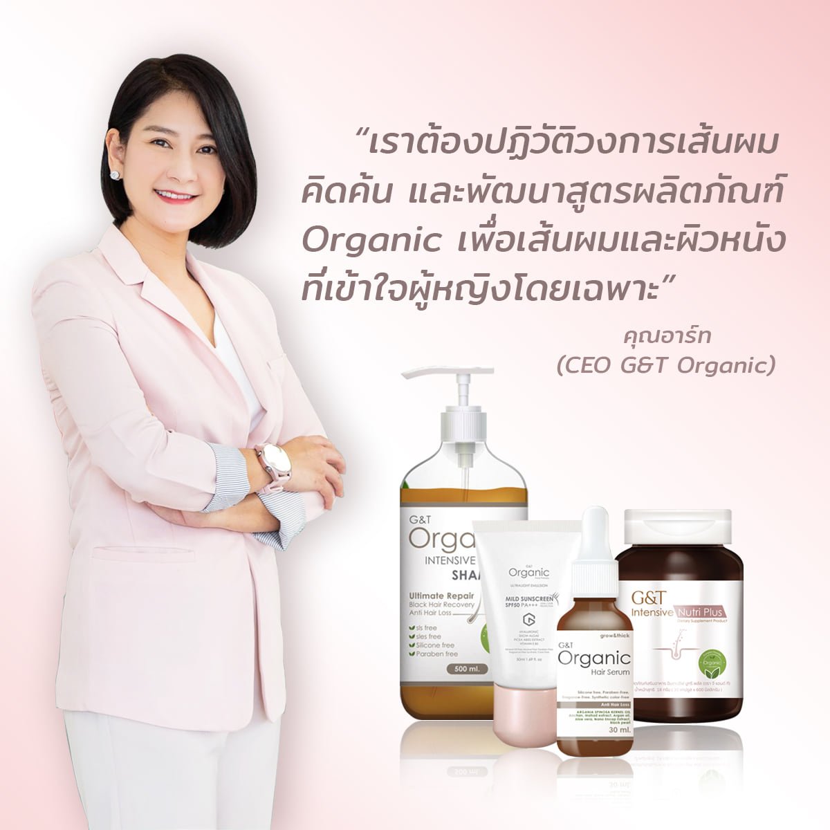 คุณอาร์ท CEO สาวสวยแบรนด์ G&T Organic วัย 41 ปี เธอได้เล่าถึงจุดเริ่มต้นของแบรนด์ว่า “อาร์ทมีปัญหาผมหลุดร่วงเป็นประจำจนผมดูบาง รอยแสกผมชัด! อาจด้วยวัยที่มากขึ้นด้วย อาร์ทเลยลองหาผลิตภัณฑ์แก้ผมร่วงมาใช้สารพัดรูปแบบ แชมพู ครีมนวด ทรีตเมนต์ แฮร์โทนิค เซรั่ม แต่ทุกอย่างกลับเป็นผลิตภัณฑ์สำหรับผู้ชายทั้งหมด ของผู้หญิงมีน้อยมากจนแทบไม่มีเลย สุดท้ายต้องใช้ตัวยา Minoxidil ทาบ่อยๆ ช่วงแรกก็ดี จนเริ่มสังเกตว่า ขนตามกรอบหน้าเราเยอะขึ้นเลยหยุด ผมก็ดันกลับมาร่วงอีกแถมหนักกว่าเก่า!