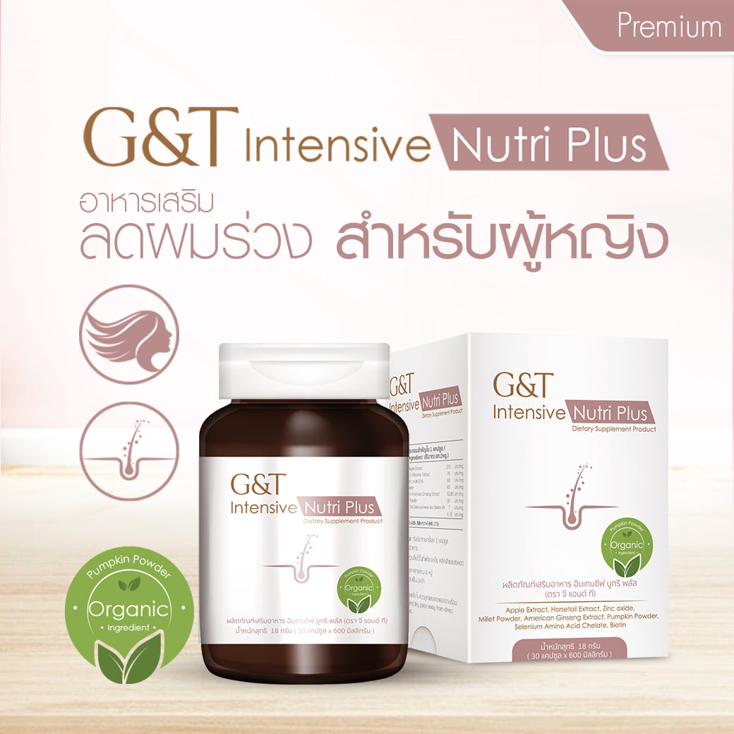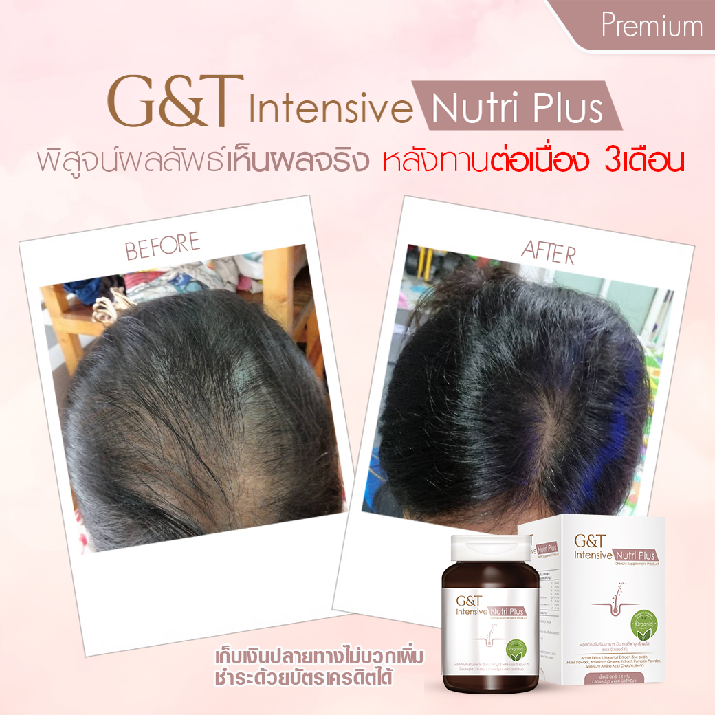ในที่สุด G&T Intensive Nutri Plus จึงเกิดขึ้น เป็นสุดยอดอาหารผมที่สามารถแก้ปัญหาผมร่วงบาง ศีรษะล้านของผู้หญิงโดยเฉพาะ ซึ่งมีคุณสมบัติชั้นเยี่ยม อย่างการตรงเข้า “ชุบชีวิตรากผมฝ่อ ฟื้นฟูวงจรเส้นผมใหม่ให้กลับมาสุขภาพดี เส้นอวบหนา ดกดำ แก้ปัญหาผมร่วงเรื้อรัง ผมร่วงเป็นหย่อม ร่วงตามรอยแสกจนกว้างได้อยู่หมัด ไม่แพ้การฉีด PRP กระตุ้นเซลล์รากผม! โดยทานแล้วจะสังเกตเห็นผมร่วงน้อยลงตั้งแต่ 1 เดือนแรก และผมใหม่งอก รอยแสกชิด ลูกผมดกแบบเห็นได้ชัดใน 3 เดือน แถมยังช่วยฟื้นฟูผมแห้งเสียชี้ฟู ให้กลับมามีน้ำหนัก สวยตลอดเส้นด้วย”