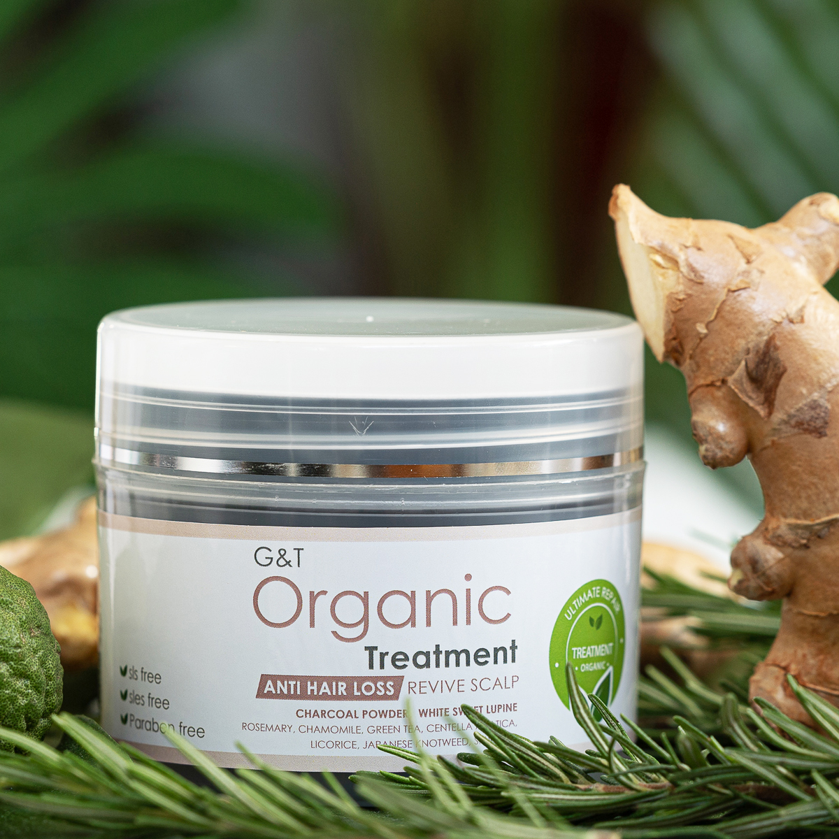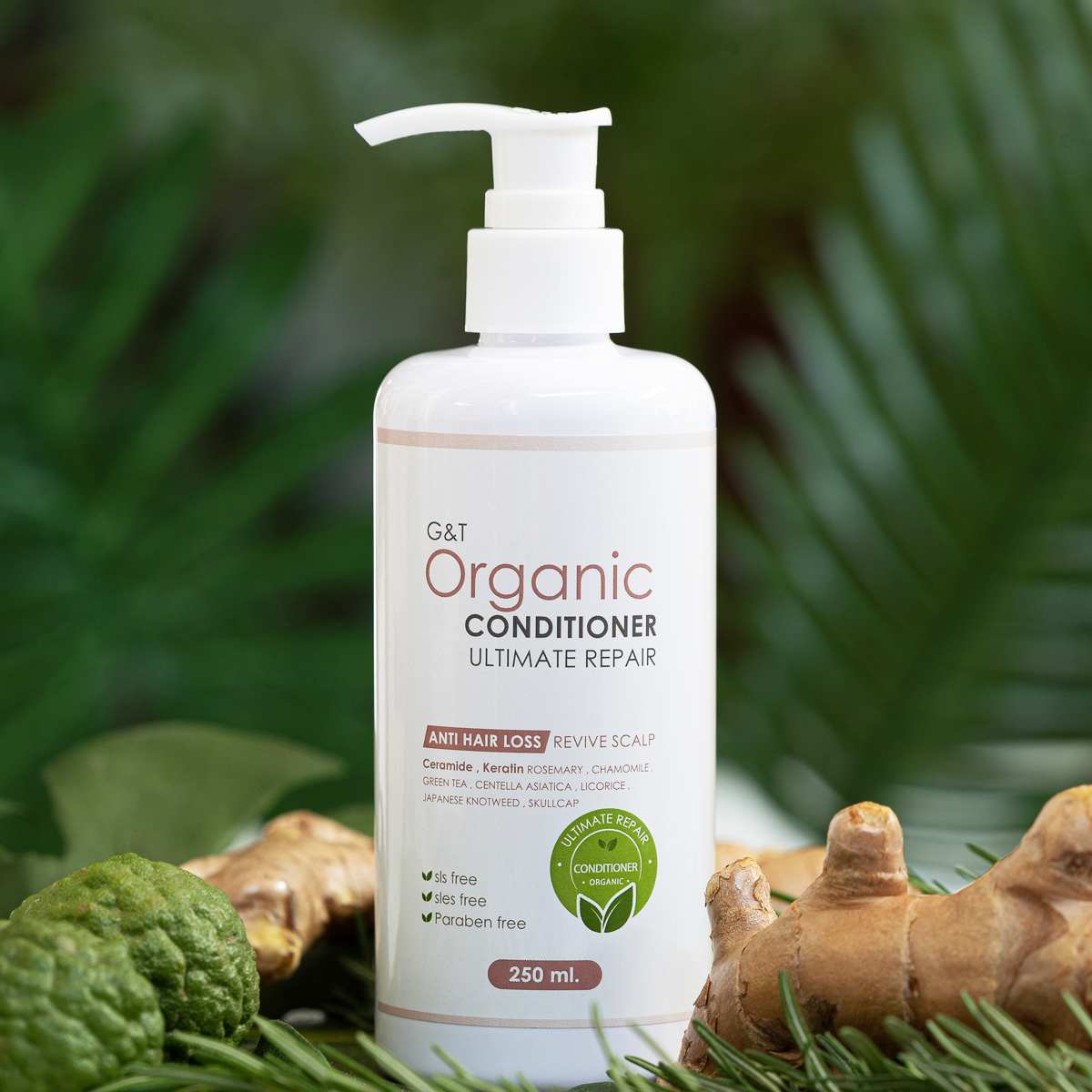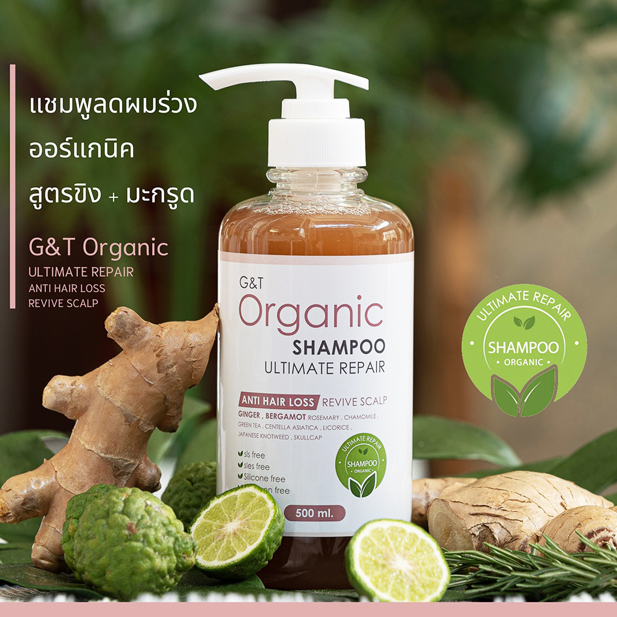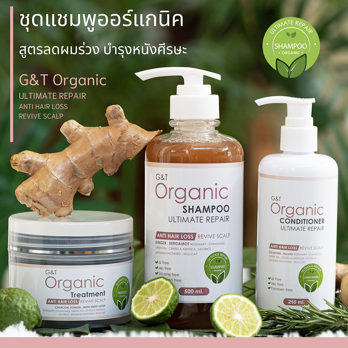 ชุดแชมพู G&T Organic Ultimate Repair - Anti Hair Loss & Revive Scalp ประกอบด้วย แชมพู ครีมนวด และทรีตเมนต์ ซึ่งตัวแชมพูเป็นแชมพูออร์แกนนิคขนาด 500 ml. เนื้อแชมพูเป็นเจลใสสีน้ำผึ้งเข้มข้นไปด้วยสมุนไพรธรรมชาติ อย่าง ขิง+มะกรูด โรสแมรี่ คาโมมายด์ฯ มีประสิทธิภาพในการบำรุงผม ฟื้นฟูหนังศีรษะ ป้องกันผมร่วง ลดการระคายเคือง ยับยั้งอาการอักเสบ ทำให้การไหลเวียนเลือดดีขึ้น ช่วยให้ผมดกดำขึ้น